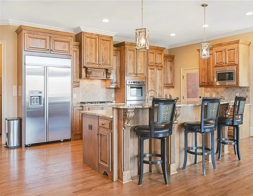 The inspiration behind this kitchen design and build was uniqueness. This kitchen, which was featured in Atlanta Home Improvement magazine, amplifies the classic styling of a white kitchen to the next level. By integrating contemporary decorative wood elements with acrylic cabinetry, traditional components meld into exceptional design. Redesigning the layout of the back wall by relocating the pantry entry to the end of the wall created space for a high end range and refrigerator and more countertop space. Incorporating European styling, deep drawers were utilized instead of lower cabinets resulting in more functional access for everyday kitchen items. The large center island features a combination of drawers and cabinets on three sides. All of this was achieved through comprehensive spatial planning while remaining within the footprint of the former kitchen.