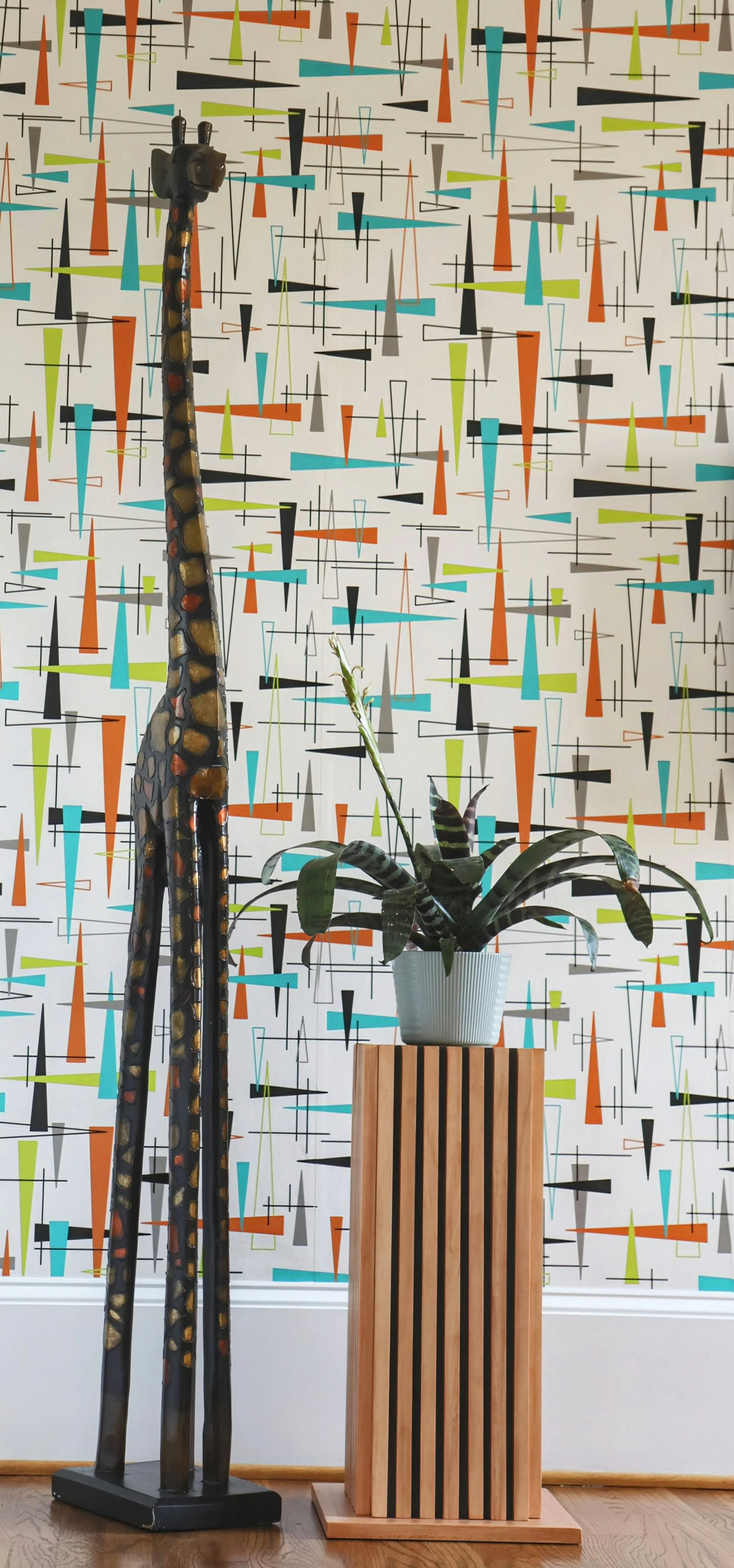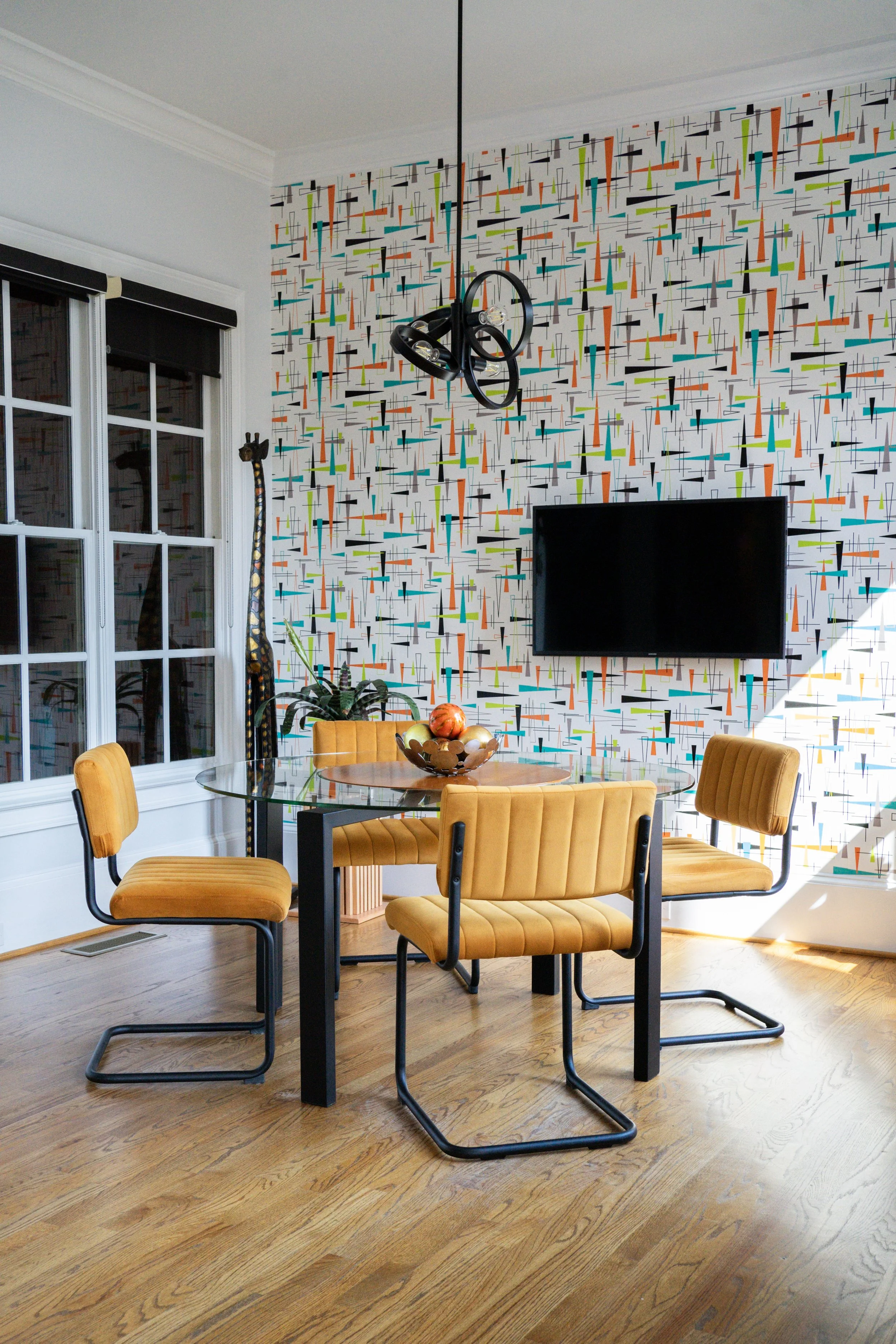 A bright and bold patterned wallpaper accent wall, a new light fixture, custom plant stands and modern furniture bring this space to life.